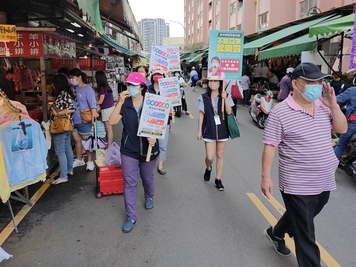 國內新冠肺炎疫情仍嚴峻,考量近日傳統市場出現採買人潮,台中市政府經發局自6月29日起連四天,由副局長李逸安、主任秘書倪世齡、專門委員林敏棋及謝公耀,分別帶隊至水湳、南屯、向上及水崛頭等傳統市場,加強宣導餐飲禁內用、市場分流運動、落實實名(聯)制、環境清潔消毒、維持社交距離等措施;稽查時攤商及消費者口罩均戴好戴滿,顯見民眾高度防疫意識。