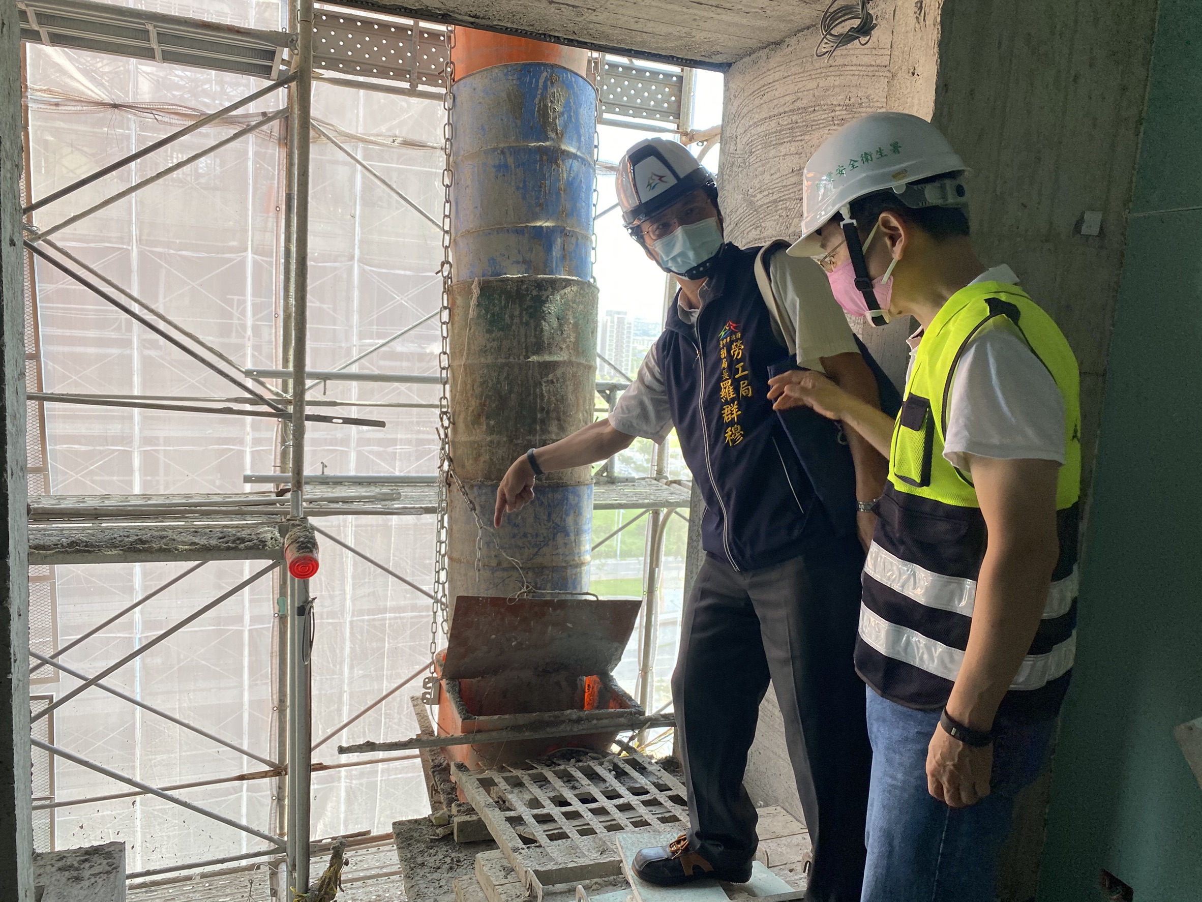 勞工局表示,近日台中市民間工程發生多起因防護設備不足,造成職業災害不幸案件,今日市府勞工局副局長羅群穆和勞動部職安衛生署中區中心主任萬榮富,率隊突擊稽查大型建築工程地,主要檢查重點以2公尺以上開口部分是否設置護欄、護蓋或安全網等防護設備、塔吊吊掛作業時是否管制人員勿進入吊掛物下方,另營建用升降機是否具備合格證等。