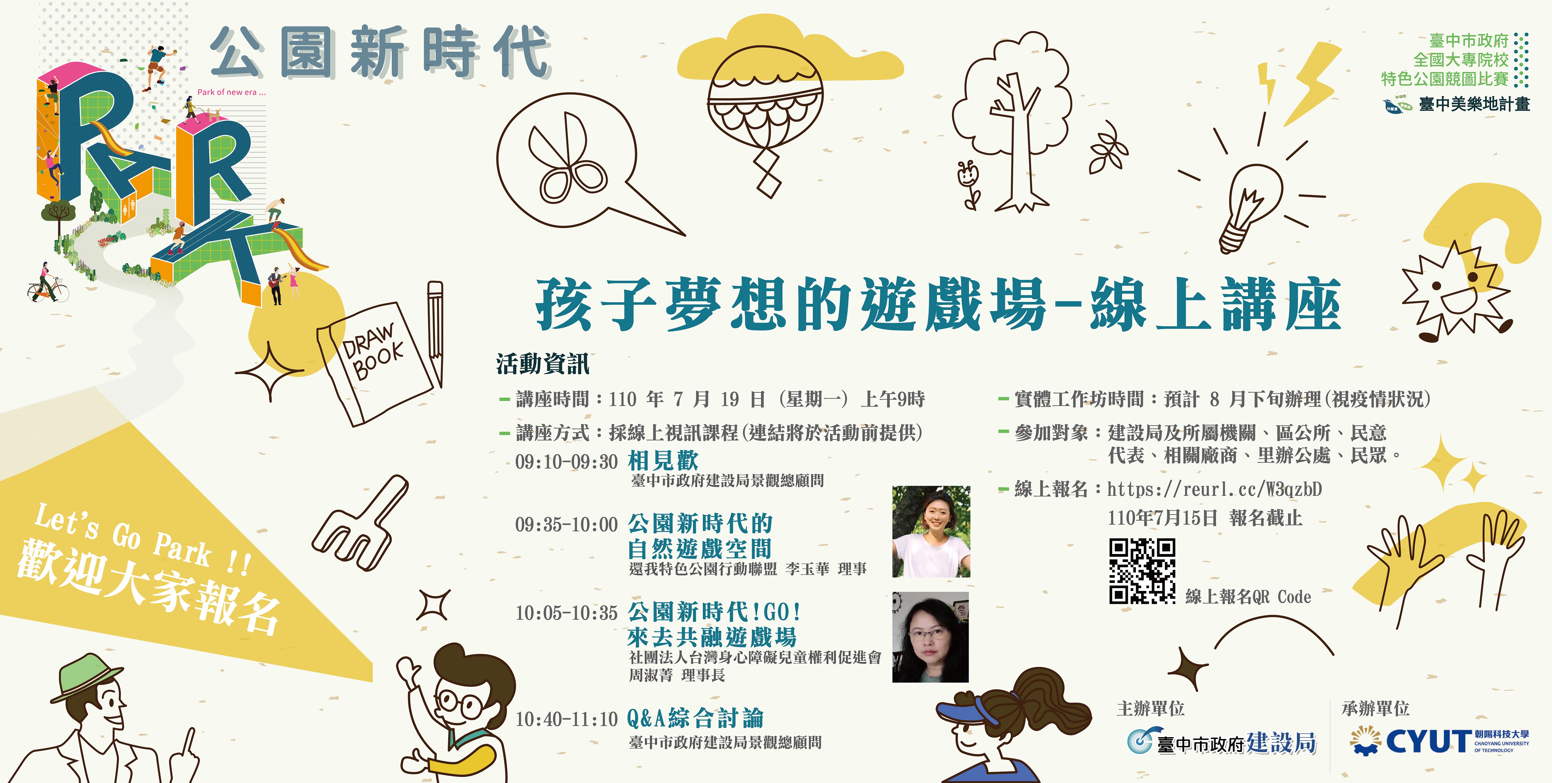 陳局長進一步說明,考量全國疫情三級警戒,此次演講改採「線上講堂」方式執行,邀請「還我特色公園行動聯盟」理事長李玉華講授「新時代的自然遊戲空間」觀念,分享如何尊重遊戲主體使用者(即兒童)在共玩的自然遊戲空間中培養各項感知能力;「台灣身心障礙兒童權利促進會」理事長周淑菁則將以「GO!來去共融遊戲場」為主題,闡述以身障兒童為本的共融遊戲場內涵。