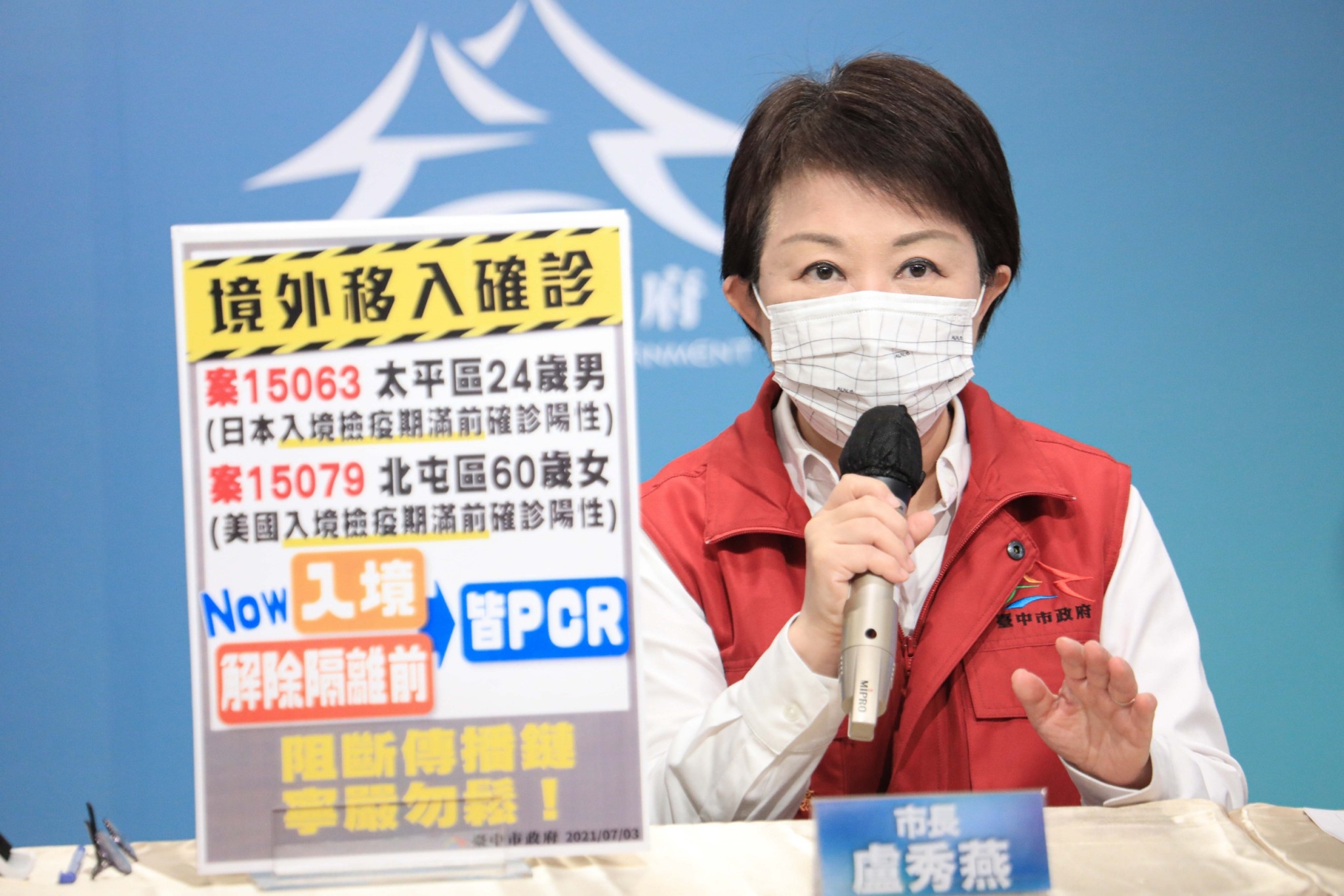 衛生局長曾梓展說明,今日新增2個案均為境外移入,案15063為太平區24歲男性,無症狀,6月18日自日本入境,搭防疫計程車到台中防疫旅館居家檢疫,期間無症狀,7月1日期滿前採檢確診。