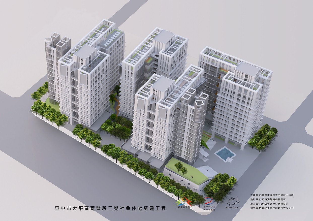 住宅處說明,太平區育賢二期好宅基地位於太平新光重劃區精華地段,緊鄰74號快速道路口,交通十分便利,也臨近學校、公園及醫院,生活機能完善。基地規劃4幢地下2層地上12層的複合混居式好宅;地面層設有店鋪26間,居住設施提供1房型(8)223戶、2房型(16)139戶及3房型(24)66戶,合計428戶優質好宅,設有共同景觀陽台、多功能活動教室及共同廚房。