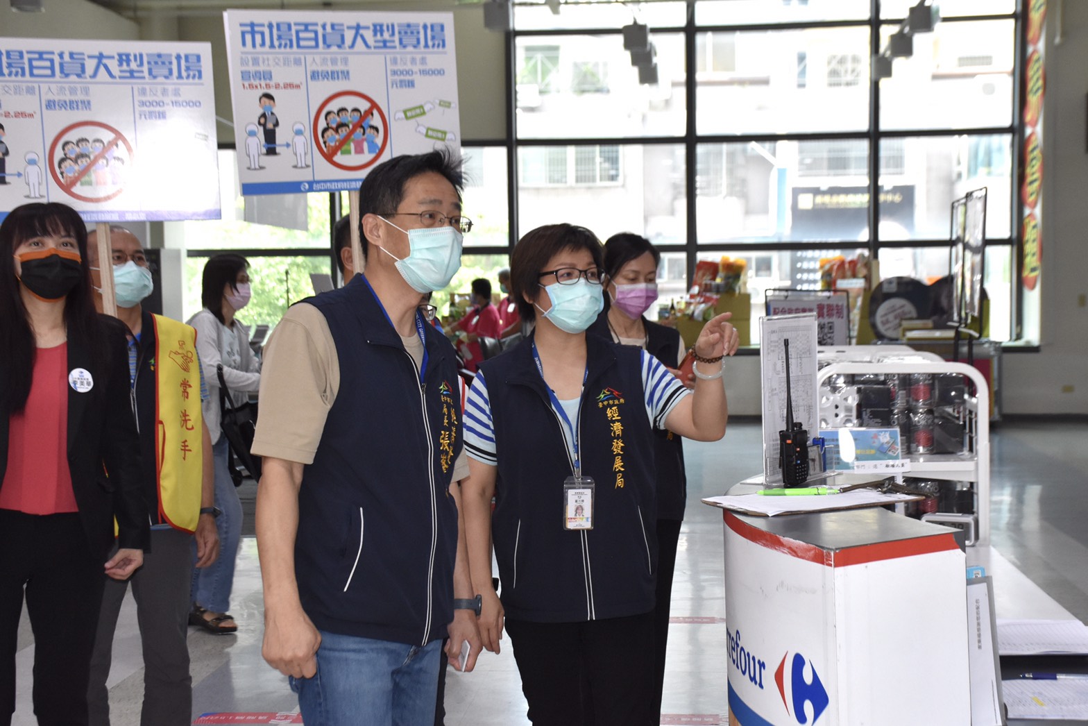 國內微解封後人潮陸續出籠,為避免民眾防疫鬆懈,市長盧秀燕昨日擴大要求百貨、大型賣場、市場也設置「社交距離宣導員」,經濟發展局長張峯源今(21)日率隊前往家樂福文心店視察設置狀況,也同步派員至第二公有零售市場視察,宣導員走動提醒民眾注意社交距離,許多民眾對此表示貼心及認同,肯定市府以嚴謹態度為防疫努力。