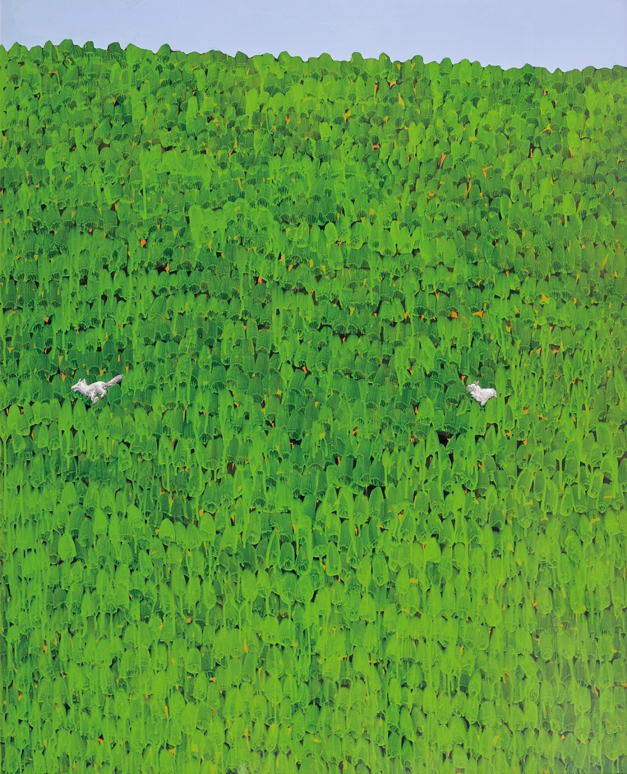除時事為題的作品,這屆也有一轉以往傳統畫風,改以俏皮可愛路線獲獎的作品,如油畫類第二名作品張如安〈關係的維度〉,以壓克力彩筆觸創造大片草地,草地中的兩隻野犬自由追逐,透過野犬的動物性,對比人類在有限的都市生活空間中所被塑造的姿態,以清新有趣的畫風帶領觀者反思人與人間、人與環境間的關係。