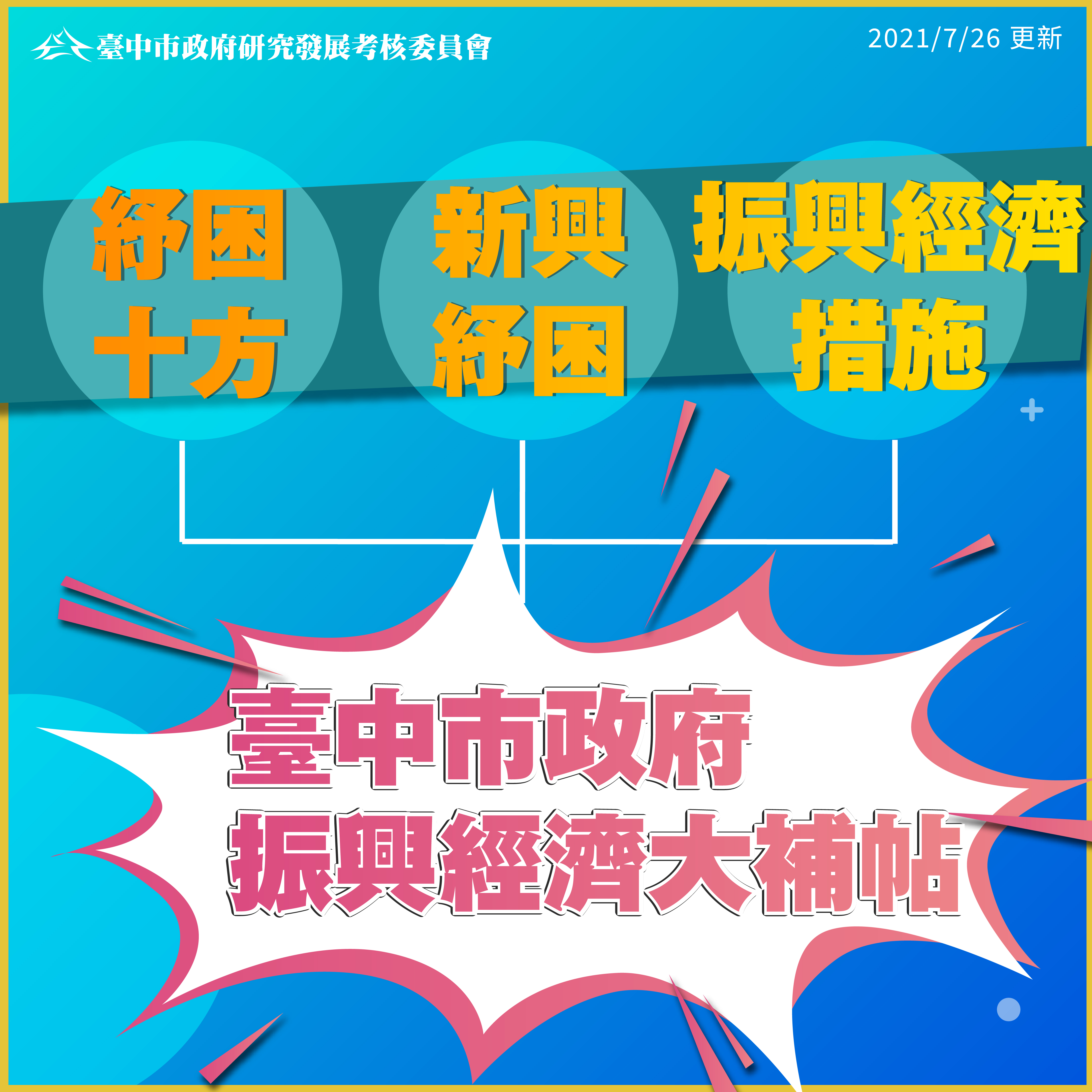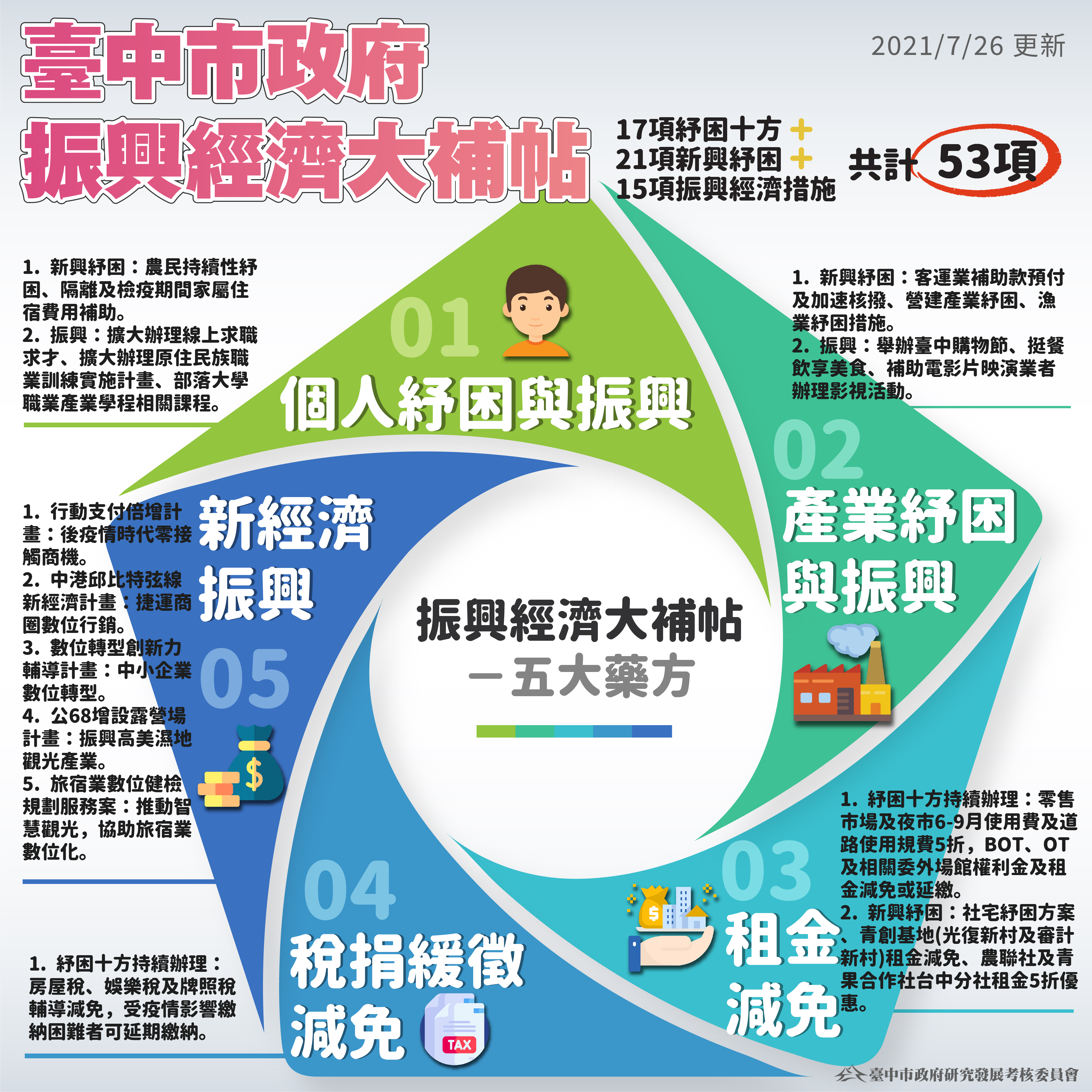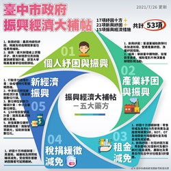 新冠肺炎疫情期間,許多民眾及產業受到不小衝擊,在市長盧秀燕的指示之下,台中市政府於疫情期間持續推動各項紓困方案,並提前研擬多樣的經濟振興措施,避免台中經濟受疫情影響而衝擊過大,同時也確保台中市的經濟量能持續發展。因中央宣布於7/27至8/9降為二級警戒,中市府今(26)日率先提出「台中市政府振興經濟大補帖」,並祭出個人、產業、租金、稅捐、新經濟等五大藥方。