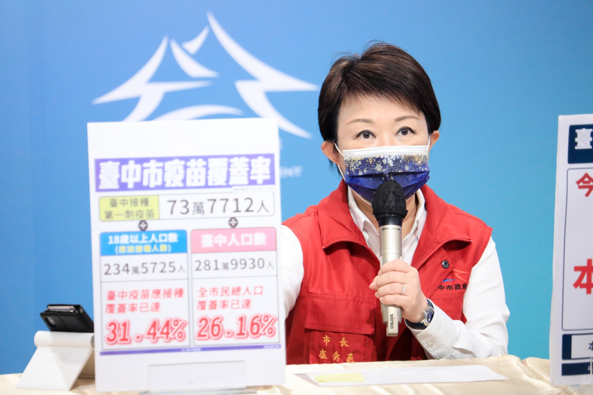 台中市今(26)日本土、境外、社區快篩陽性「三零」,統計至今日中午12時,已接種第一劑疫苗有73萬7712人,疫苗應接種率達31.44%、全市民總人口數接種率26.16%;此外,市長盧秀燕也宣布,因應「教育、社福、身心障礙、長照」四大系統優先解禁場域需求,規劃四類人員共近2.2萬人施打疫苗,包括補教業人員、居家托育人員、視聽障朋友及參加全國運動會的台中選手,預計7月29日於快打站接種。