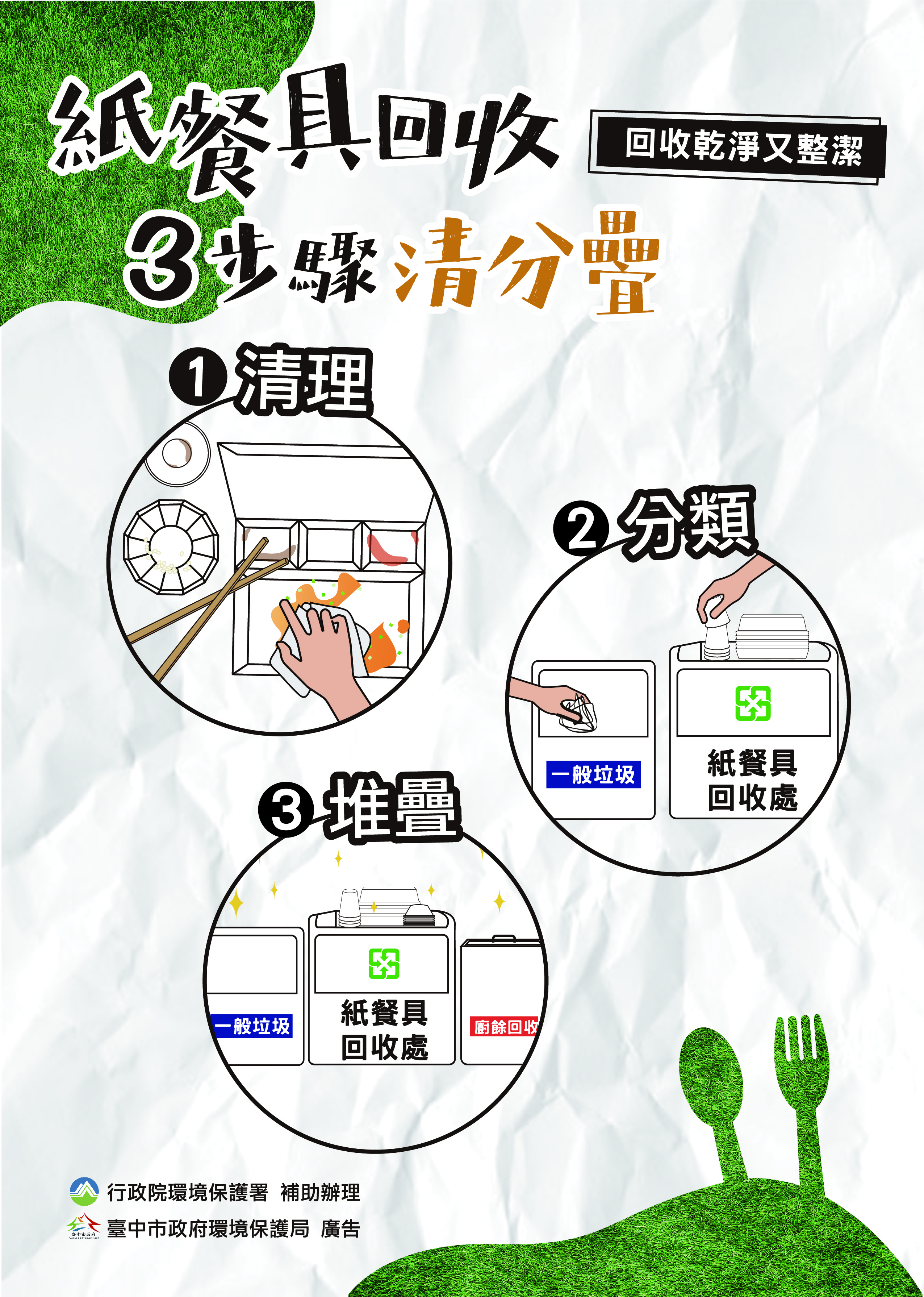 環保局呼籲,消費者用餐後響應回收3步驟「清理、分類、堆疊」,簡單回收步驟就可減少回收人員的辛勞;另因紙餐具內層有塑膠淋膜,交付回收業者或清潔隊回收時,請與一般紙類(如報紙.紙箱)分開回收,落實分類,一同減少廢棄物產生,為環保盡一份心力。