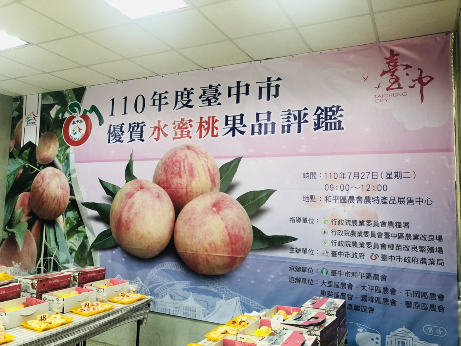 推廣台中優質農特產品,提升水蜜桃栽培技術及果品品質,台中市政府農業局輔導和平區農會今(27)日於和平區農會展售中心舉辦「110年度台中市優質水蜜桃果品評鑑活動」,共66組報名參賽,依據水蜜桃外觀果形、質地風味及糖度等項目進行評分,最終由農友楊詠盛勇奪冠軍,成為今年度的水蜜桃達人,第二為農友李東榮及林美子,第三名則由農友蔡芳松、張桔寬及余耀南獲得。