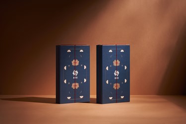 「喜豐香」的「四季茶韻八入禮盒品」視覺主元素為芙蓉花與桂花,以藍色呈現品牌沉穩內斂形象,並將成雙成對的概念運用在包裝,內包裝使用薄紙板,袖套盒設計除可減少包材也可重複利用,從包裝設計到口味創新,結合傳統與新意。