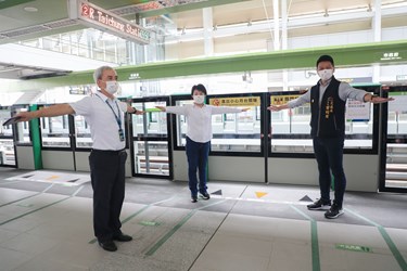 盧市長今日於市政府站視察旅客從進入車站、搭乘電扶梯至進站閘門、月台區候車、搭車等過程中各項防疫作為,包括進站酒精消毒、電梯九宮格分散站立、收費閘門設熱顯像儀、進出站及列車上掃描實聯制QR Code、月台張貼排隊距離標示、車廂拉環僅保留1/3、防疫廣播及隨車員防疫裝備等。