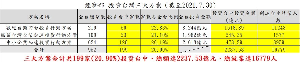 經濟部公布「投資台灣三大方案」,截至今年7月30日,台中市吸引199家業者投資,投資金額達2,237億元
