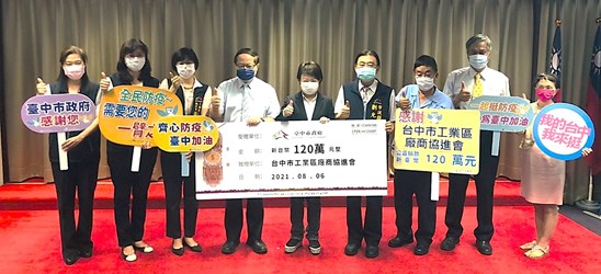 台中市工業區廠商協進會有感第一線防疫人員的辛勞,號召第11屆團隊成員的力量,募得120萬元防疫捐款,捐贈給台中市政府,攜手共同對抗疫情,市長盧秀燕今(18)日出席捐贈儀式代表受贈,並感謝各界善心,她表示,市府將妥善規劃使用善款,投入防疫工作所需資源,守護市民健康安全。