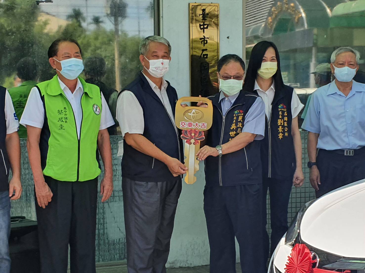 民政局長吳世瑋主持交車儀式,與石岡區長劉素幸共同將汽車鑰匙交予九房里守望相助隊