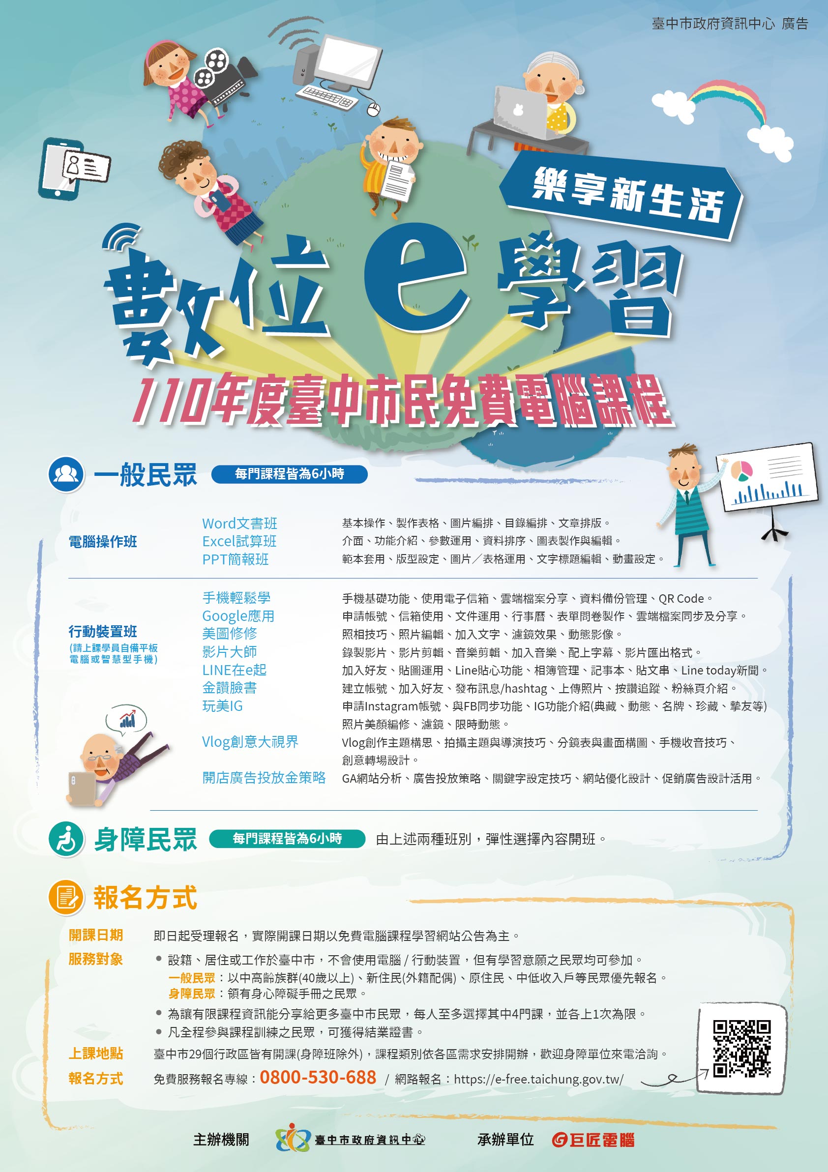 研考會主任委員吳皇昇表示,今(110)年的市民免費電腦課程原訂6月開班,因應全國疫情三級警戒,為配合防疫規範及考量民眾安全,決定延後開課。日前中央宣布調降為二級,防疫措施逐步解封,經審慎評估並確認依市府規定完成預計開班地點的復課申請後,訂於9月份起正式開課,課程內容包括電腦操作班(Word、Excel及PPT)、行動裝置班(社群軟體、照片及影片編輯、及Vlog等課程),都非常貼近生活實用,歡迎民眾踴躍報名,藉由此次學習讓學員能活用在日常生活中,讓科技更貼近人性。