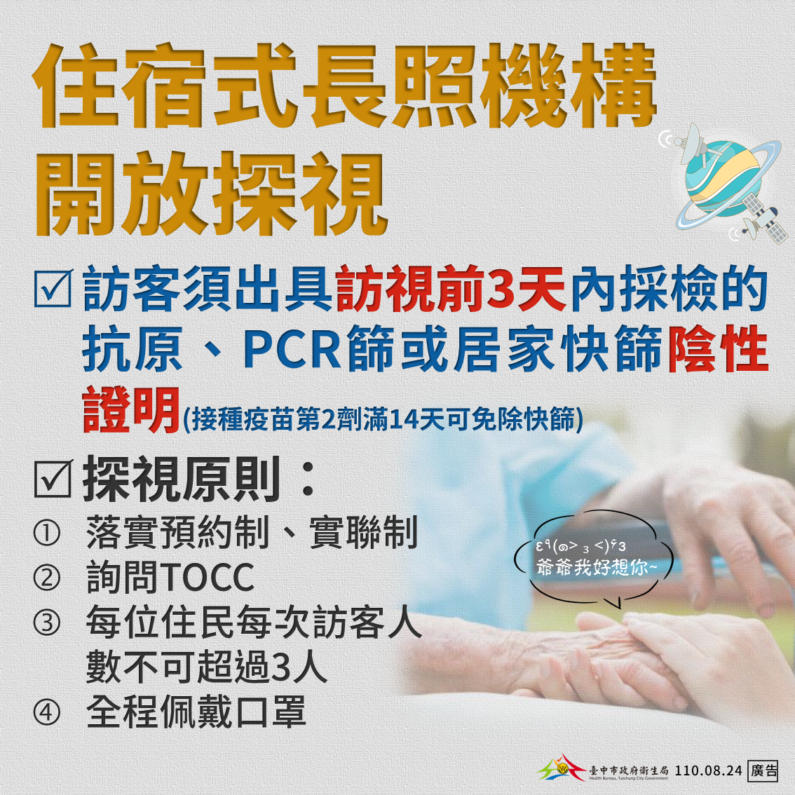 考量長照機構住民家屬探視需求,台中市政府衛生局配合中央政策自8月18日起有條件開放訪客可進入住宿長照機構探視,各住宿機構的住民第一劑新冠疫苗施打率達8成且工作人員施打率達9成,並落實防疫政策,即可有條件開放探視,衛生局將持續不定期查核,確保住民及家屬健康。