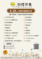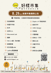 推動青年創業圓夢,台中市政府勞工局與台中各大學持續合作,舉辦今年第7、8場「Young!好樣市集」,將於8月28、29日11時至17時在光復新村青創基地登場,每場市集提供20個攤位,展售具原創性的特色商品,歡迎大家來市集走走逛逛,選購屬意的特色商品。