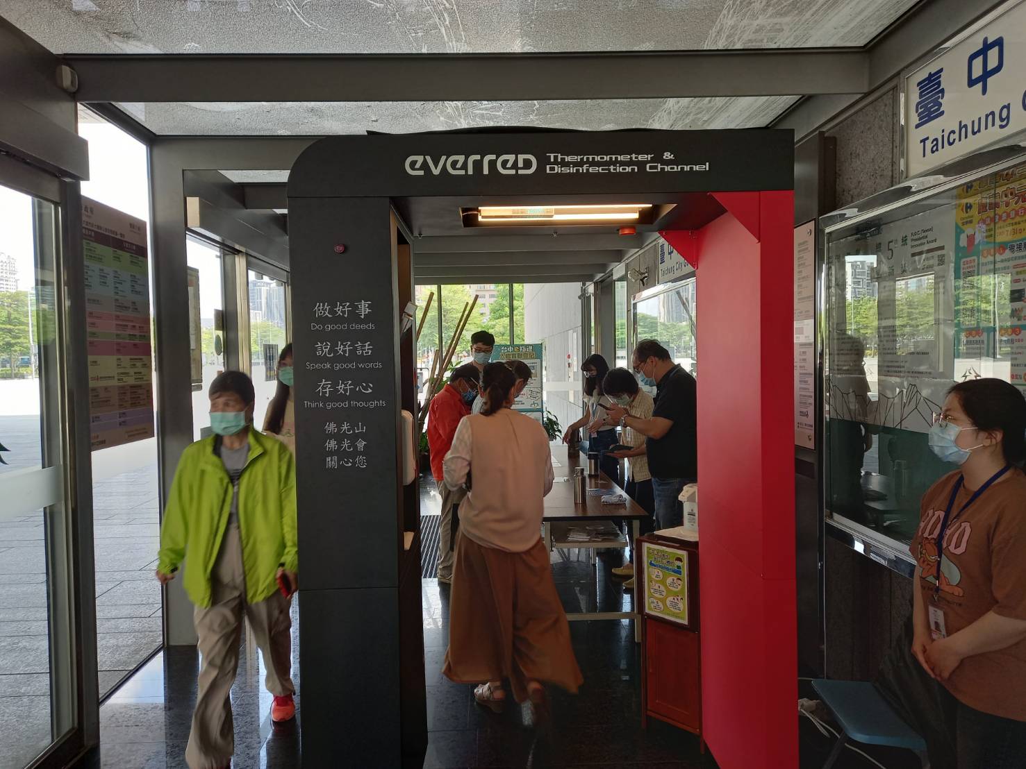 新冠疫情期間,國際佛光會中華總會發揮慈悲濟世精神捐贈台中市政府防護衣、隔離衣及護目鏡等各項防疫物資,守護第一線防疫人員自身安全,日前再捐贈2座具非接觸式額溫測量、自動手部酒精噴霧、光氫離子消毒等功能的「智慧防疫門」,分別裝設於市政大樓文心樓與文心第二辦公大樓門口,台中市政府民政局感謝各界支持,一起守護洽公民眾及市府同仁健康安全。