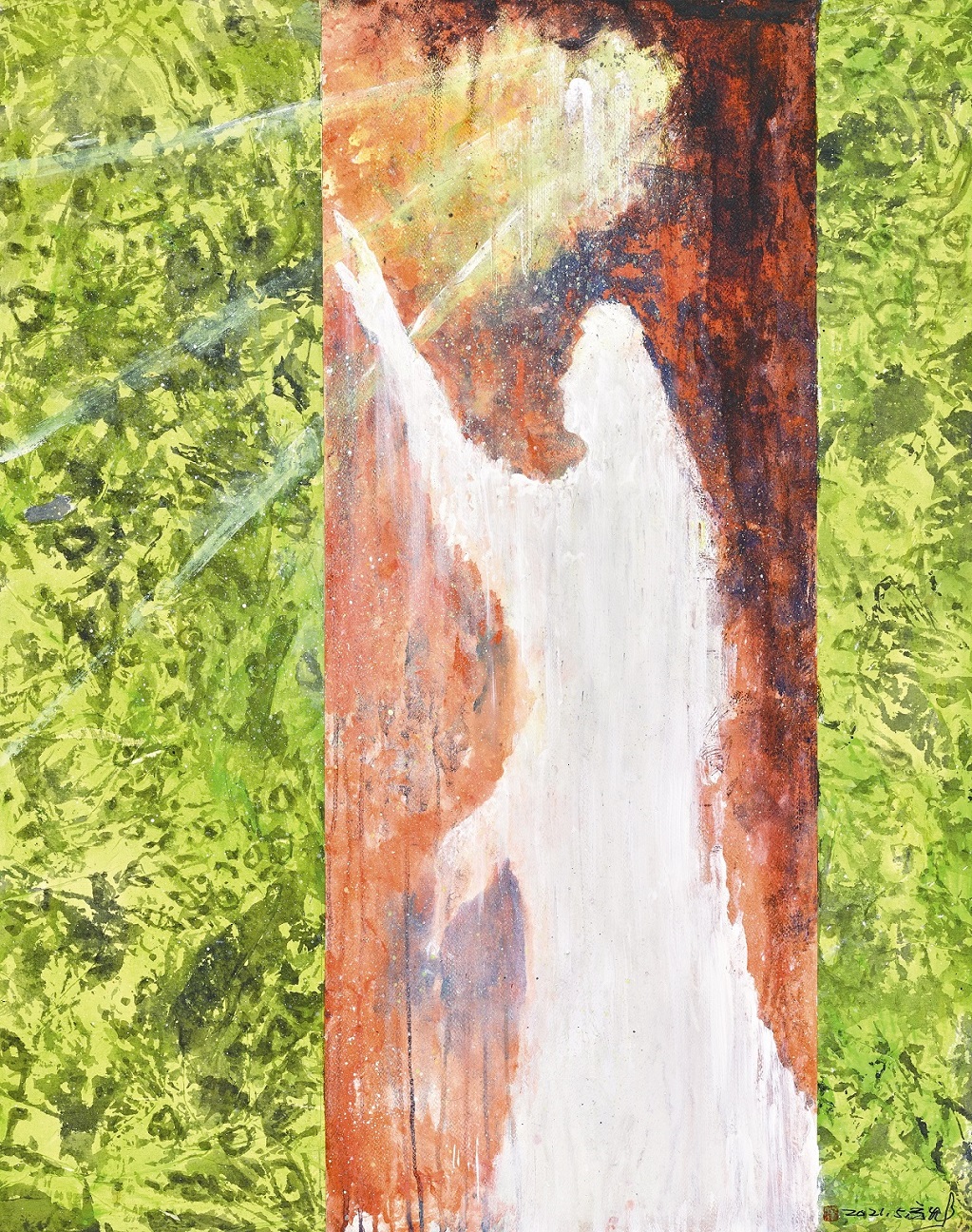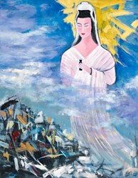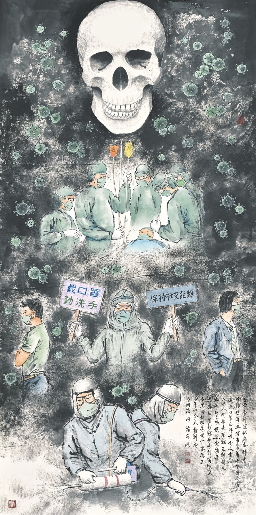 此外,王世慈的《上班好境界》,表現創意工作者居家辦公的樂趣,作品乍看是篆書,仔細端看才發現是英文書寫「Well Paid, Easy Job, Work from Home」,是突破書體限制的創意書法;膠彩類曾懷德的《防疫》,刻畫全副武裝的防疫人員,努力讓大地重現生機綠意;水彩類方草的《白色觀音》畫作,則向守護台灣防疫第一線的醫師、護理人員致敬。