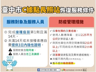 此外,台中市C據點長照站自86日起,也陸續輔導全市103家據點有條件恢復服務。除參加據點活動的長輩及工作人員須依規完成第一劑疫苗接種且滿14日或自費篩檢外,對於活動空間規劃,使用人數應降載,以每人2.25平方公尺計算容留人數,且暫不提供喘息服務,餐飲不開放內用,改採餐盒外帶或外送服務。