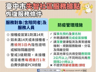 考量失智服務對象及家庭照顧者需求,台中市依據衛生福利部於今年722日訂定「失智社區服務據點因應COVID-19防疫管理指引」有條件恢復服務,凡參加據點活動的長輩及工作人員都應接種疫苗第一劑且滿14日,未接種疫苗或接種第一劑疫苗未滿14日者,首次提供或接受服務前,須自費提供3日內快篩或PCR陰性證明,以維護長輩及工作人員健康;餐飲服務則採分批用餐,以梅花座或使用隔板保持社交距離。