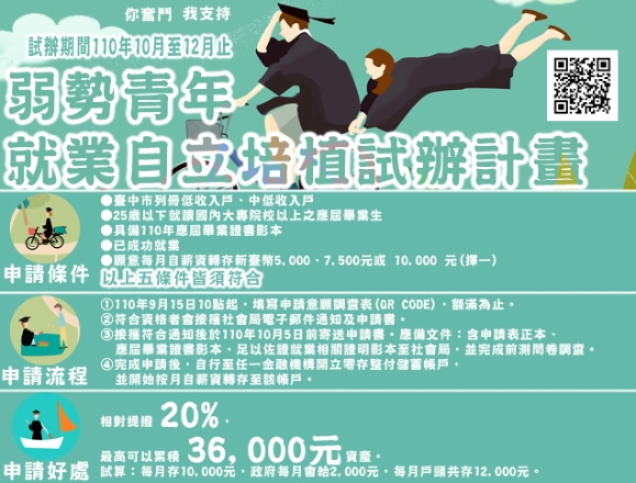 因應疫情影響,減輕職場新鮮人的經濟壓力,台中市政府社會局鼓勵弱勢青年累積資產,針對今年應屆畢業低收入戶、中低收入戶青年,只要穩定就業、開戶儲蓄,加碼相對提撥存款20%,試辦期間從10月至12月,為期3個月,最高補助6,000元,915日起將開放意願調查,名額75位,額滿為止。