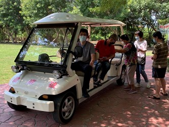 大肚區長白峨嵋指出,配合快打站撤離校園,大肚區快打站調整至大肚運動公園太極拳訓練場為民眾提供接種服務,由於快打站場所距離園區路口約200公尺,為減輕行動不便長者行動負擔,調用2部電動高爾夫球車接駁民眾至快打站,民眾搭乘高爾夫球車漫遊綠意盎然的公園內,間接舒緩民眾接種疫苗的緊張情緒,民眾紛紛感謝市府及公所的貼心,直呼打疫苗還能體驗「微旅遊」的渡假氛圍,相當有趣。