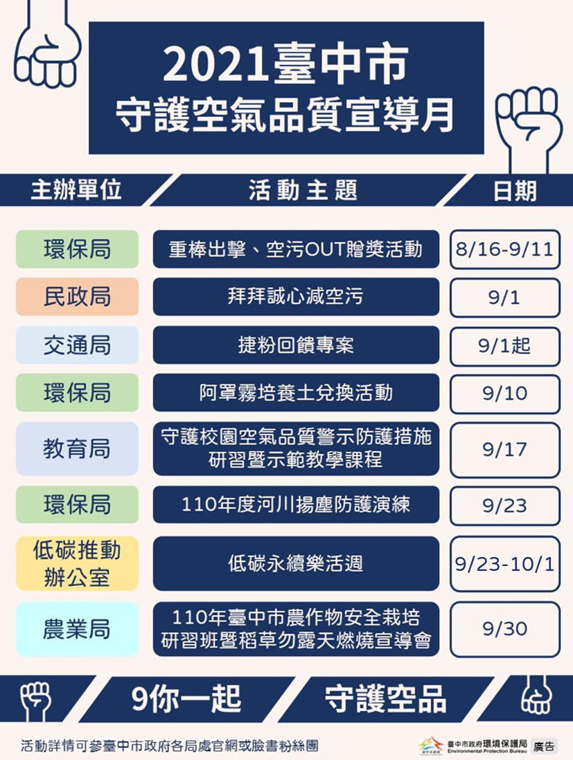 有感於全球暖化造成的極端氣候影響,台中市政府環境保護局自109年起,將每年9月訂為「守護空氣品質宣導月」,聯合市府各局處共同辦理系列活動加強宣導減碳減污,今年度除環保局外,民政局、交通局、教育局、農業局及台中市低碳城市推動辦公室也共同響應。另外,明(22)日同時也是國際無車日,今年雖因疫情影響,未辦理低碳步行或自行車騎乘活動,仍盼市民配合響應並選擇低碳通勤方式,減少私人運具使用,共同守護空氣品質。