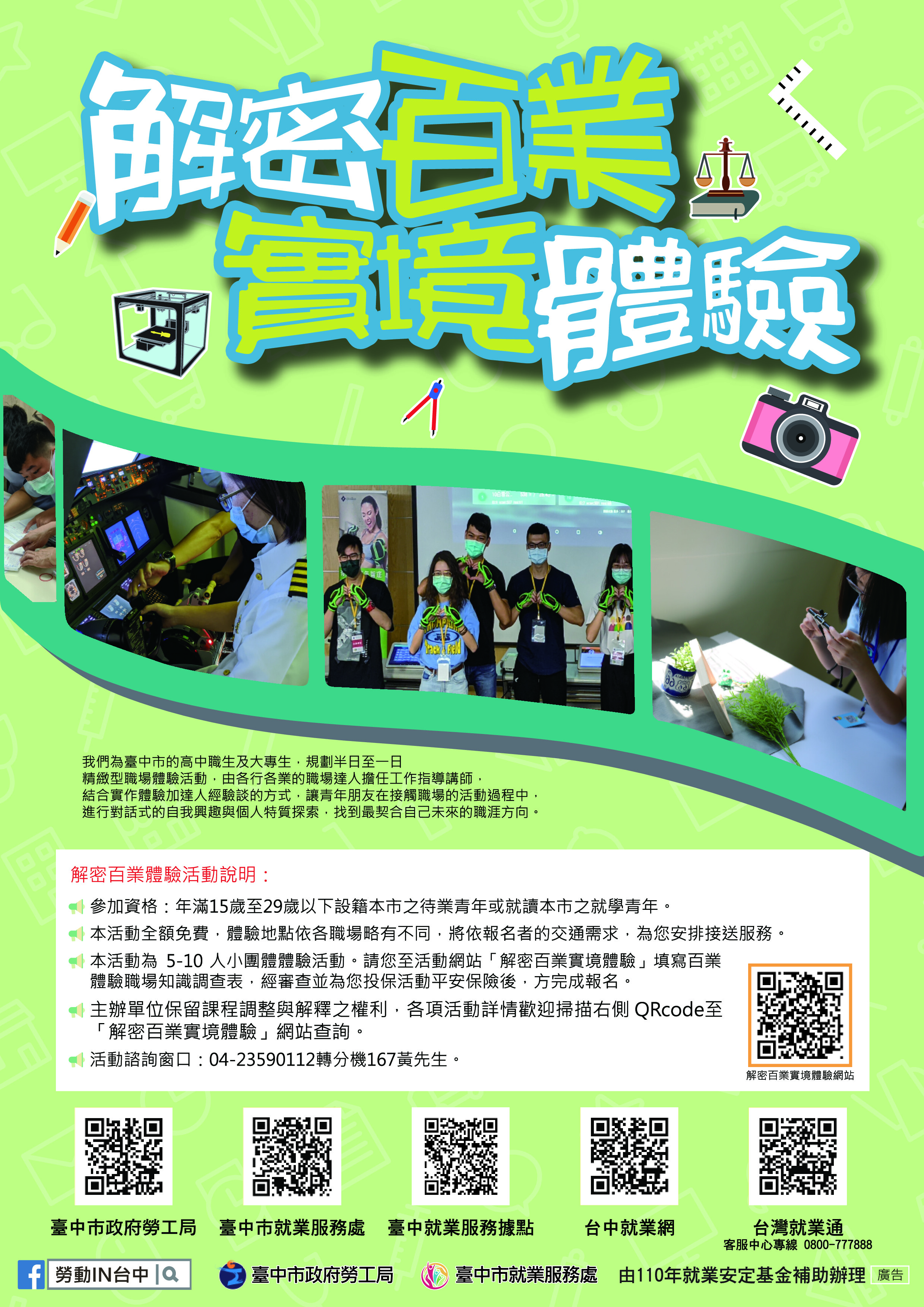 台中市政府勞工局推動「解密百業 實境體驗」職場體驗活動,結合行政院勞動部推出的「110年應屆畢業青年尋職津貼計畫」,以後疫情職場解密為主題,讓青年實地體驗瞭解各產業因應疫情帶來的產業新風貌,掌握職場需具備的發展技能,為在學接軌就業打造最佳前進路線,活動開放報名中,歡迎青年朋友踴躍參加。
