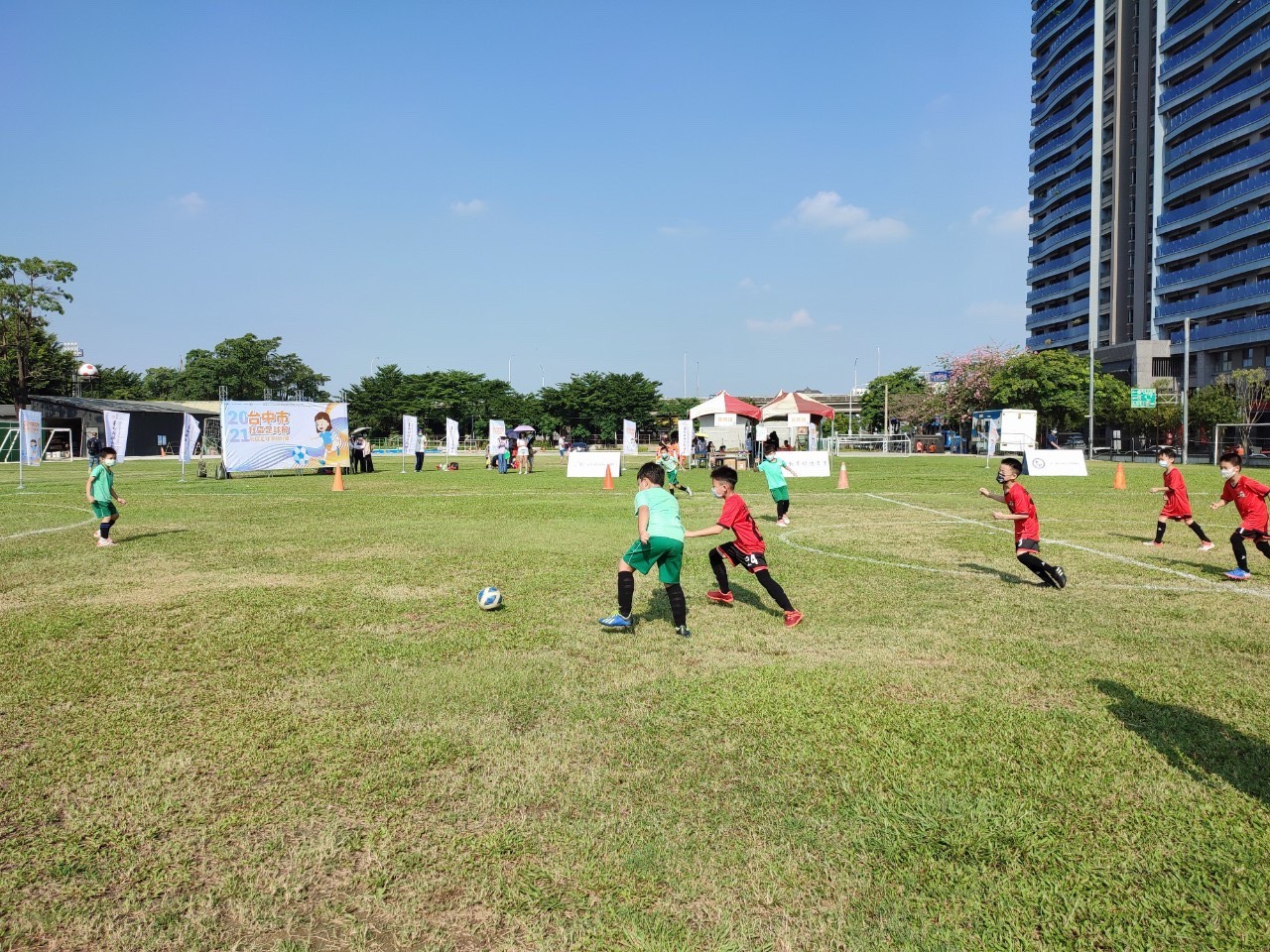台中市政府運動局「2021社區足球深耕計畫—台中市社區足球節」於屯區、海線、山線及豐原4區陸續登場,今(25)、明兩日率先在台中朝馬專用足球場及清水運四牛埔仔運動公園舉行,有U6幼兒組、U8及U10國小組,吸引33隊熱情參賽,體驗足球樂趣,運動局感謝中華民國校園社區運動聯盟協會共同推廣迷你足球運動,打造台中足球酷運動、酷城市!