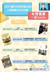 10月10日是世界心理健康日,為因應民眾受到新冠肺炎疫情影響,恐產生的心理健康問題,台中市政府衛生局10月以「心理健康一起SMILE」為主題,於國立公共資訊圖書館、大墩文化中心、維他露基金會舉辦10場不同主題心理健康講座及4場影展,內容多元,包括探索成年親子關係修復、網路霸凌、職場生活等層面的心理議題,歡迎民眾踴躍報名參加。