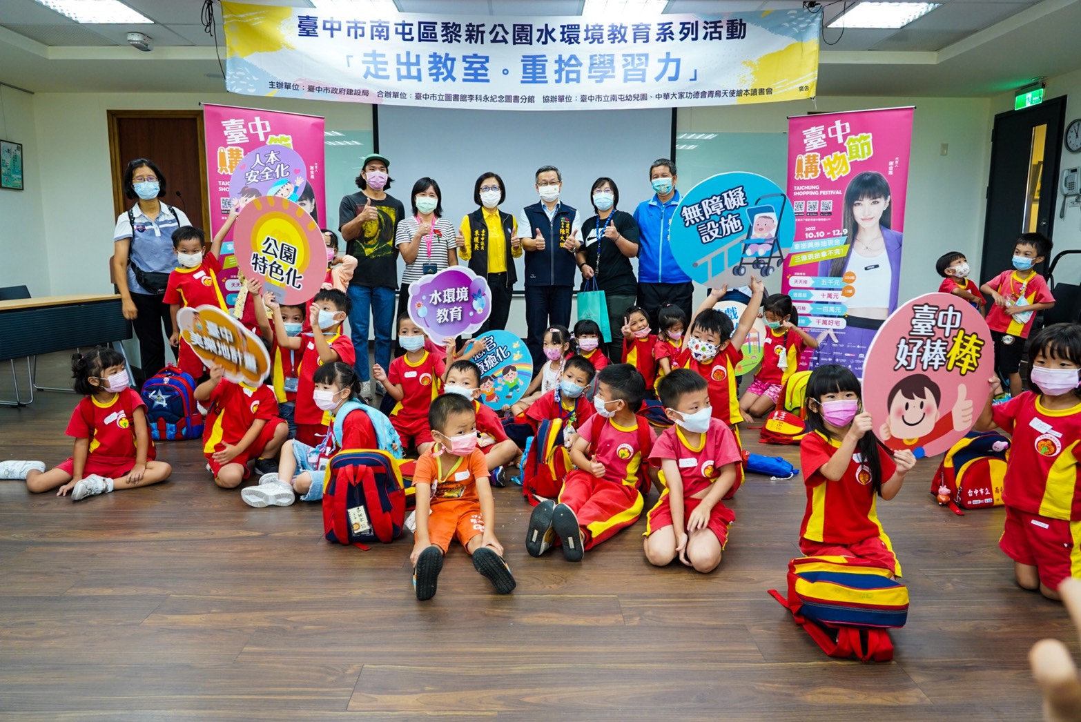 台中市長盧秀燕積極推動台中美樂地計畫,打造寓教於樂的大自然教室,市府建設局今(14)日及16日於南屯區黎新公園舉辦兩梯次水環境戶外教育活動,邀請鄰近學校師生來公園認識水循環概念與水資源工程建設,建設局長陳大田化身解說員,為參訪的小朋友們解答,透過主題分享、活動操作及實地參訪,讓孩子們從小建立惜水觀念。