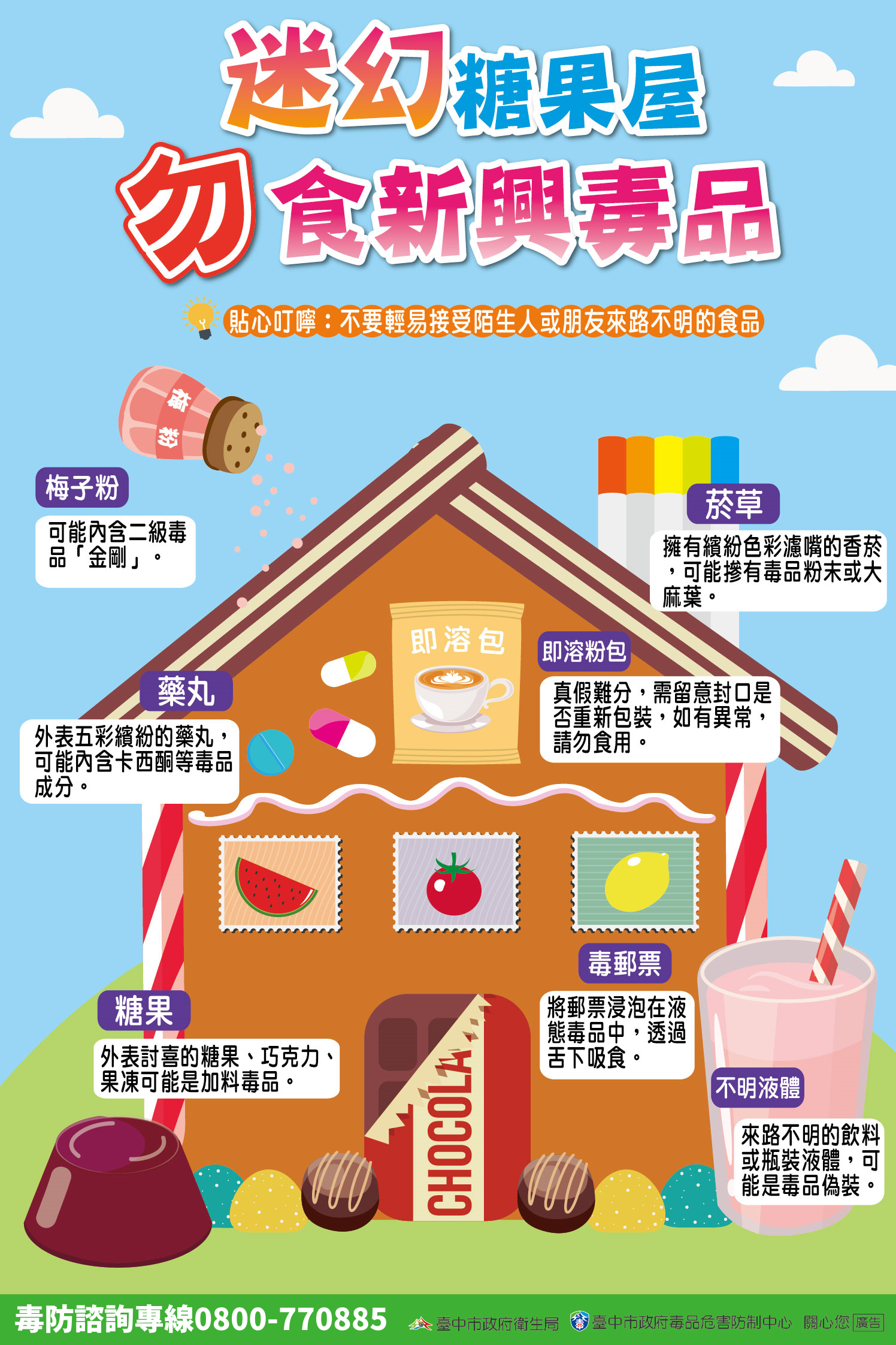 曾局長也呼籲,家長需提高警覺、謹慎檢查孩子帶回家的糖果或零食,小心查證來源,以免造成憾事。如發現親友作息改變、行為異常或情緒變化大,請主動關心並協助其遠離毒害,另提醒外出記得配合防疫政策佩戴口罩及勤洗手,民眾如有任何毒品防制相關問題,可撥打毒品防制專線0800-770885洽詢,或加入台中市政府毒品危害防制中心官方LINE「@yfh9327e」,由專人提供服務。