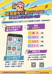 該局進一步說明,為了推廣e化繳稅,於今年10月22日至12月2日期間使用行動支付及電子支付帳戶繳納台中市地價稅成功者,即可參加抽獎活動,最大獎有超商禮物卡1萬元,歡迎民眾多加利用。