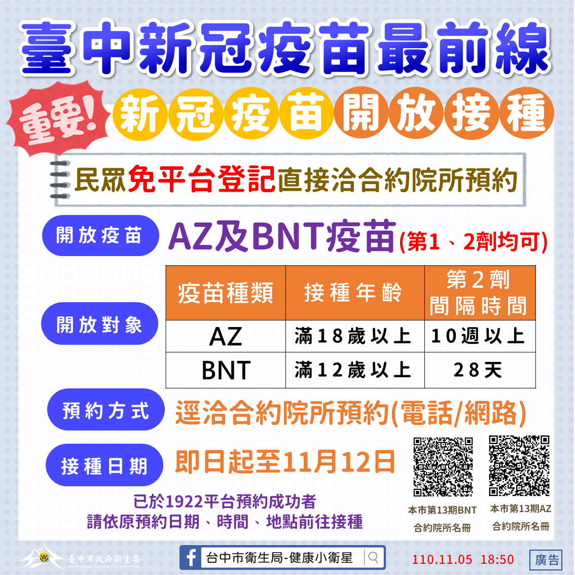 中央流行疫情指揮中心今(5)日宣布鬆綁疫苗使用規定,完成預約民眾依約報到並經醫師評估即可接種疫苗,不須湊足一定人數才可開瓶,並建議合約院所事先採取備選名單。台中市初估第13期接種結束後AZBNT疫苗有餘裕,已規劃由醫院、診所依疫苗類別分流開診,115日至12日免透過1922預約平台,BNT可逕洽合約院所、AZ疫苗則可洽台中市合約醫院預約。