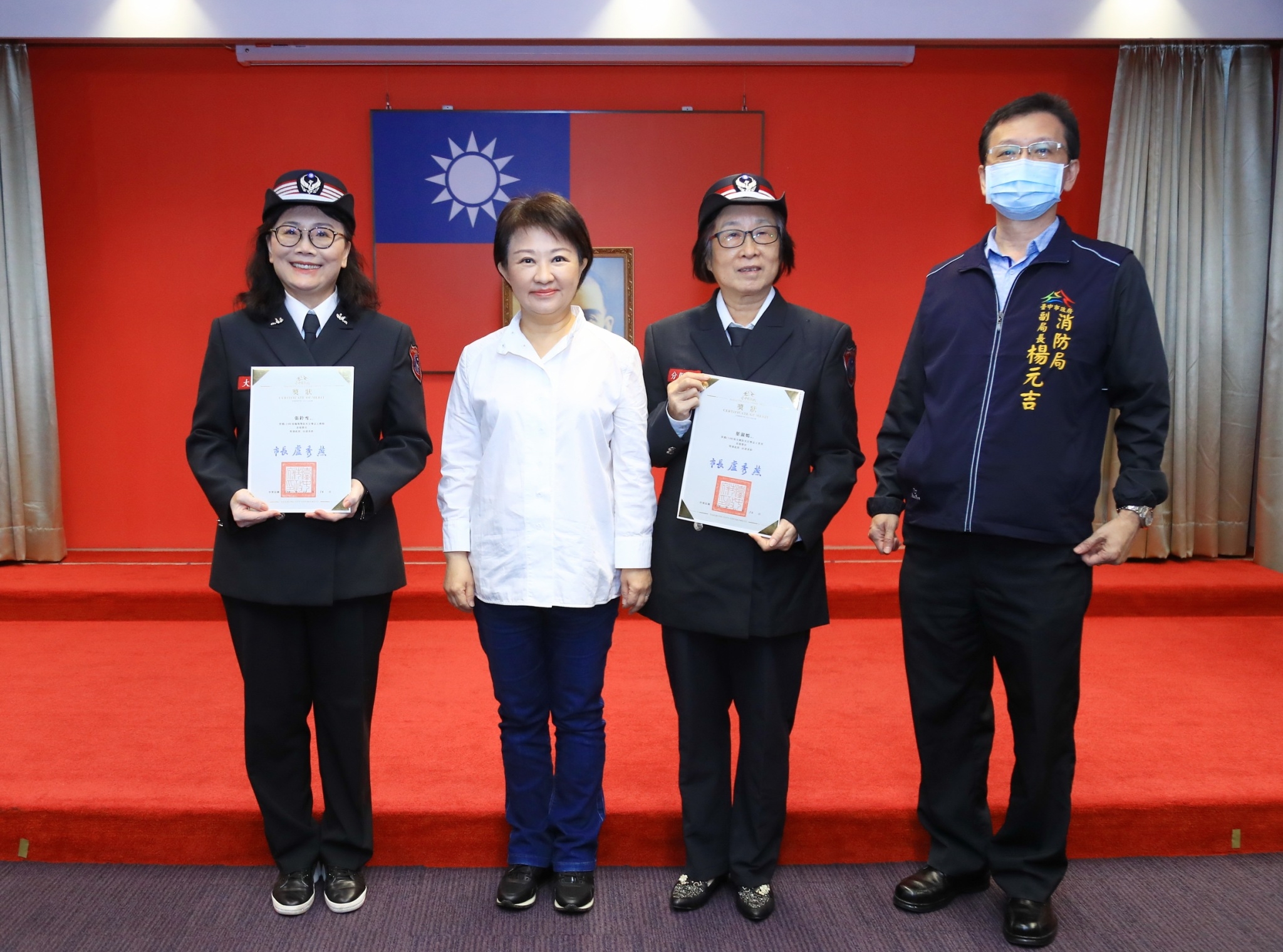 台中市政府消防局日前接獲內政部消防署通知,台中市義勇消防總隊婦女防火宣導大隊長張鈴雪,以及第三中隊霧峰分隊長葉淑嫣,分別榮獲「110年度鳳凰獎防火宣導志工楷模」及「110年度全國防火宣導志工菁英」殊榮,市長盧秀燕昨(16)日在市政會議頒發獎狀,感謝宣導志工盡心付出。