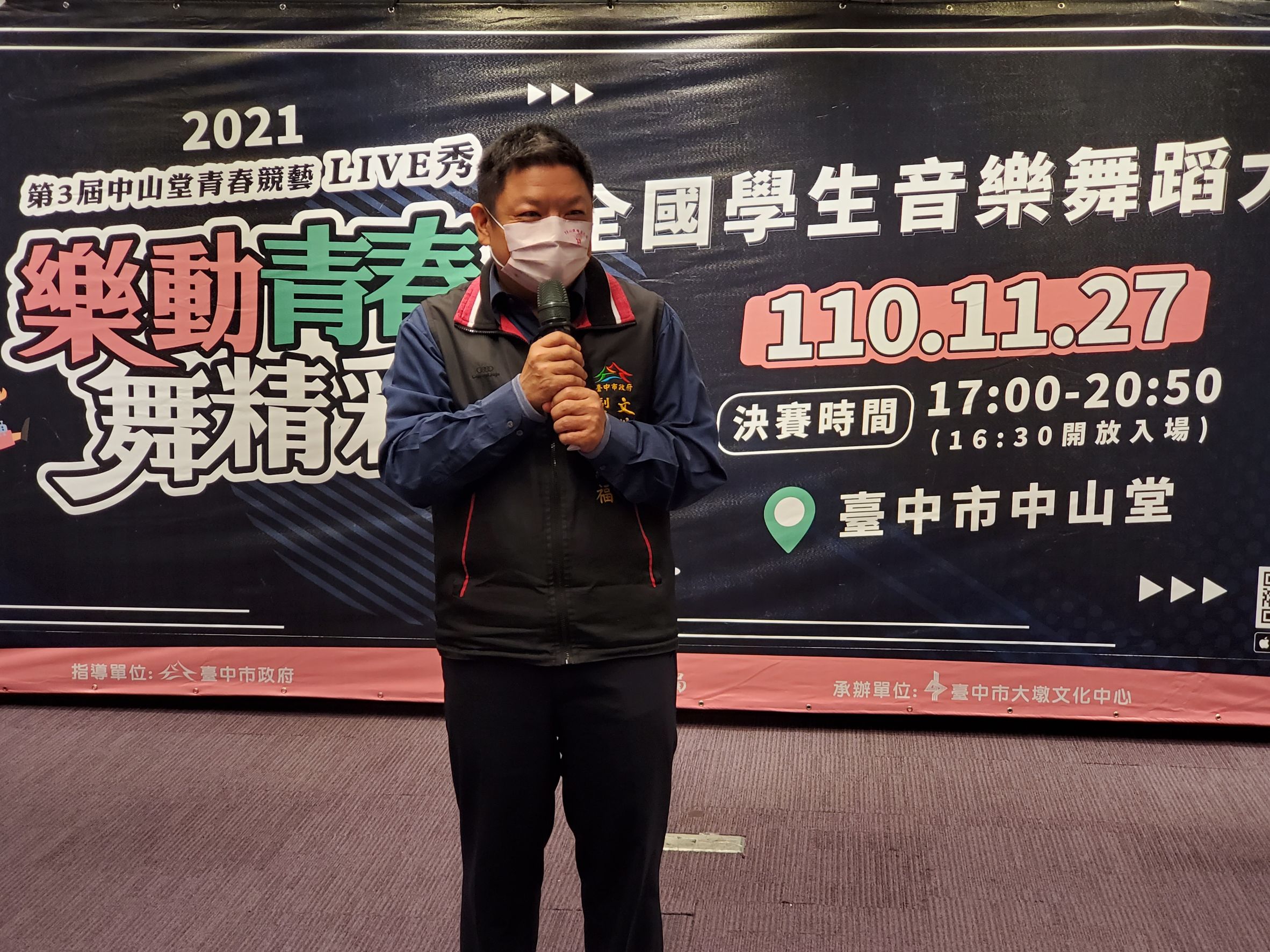 文化局副局長施純福致詞時表示,文化局為鼓勵青少年透過舞蹈及音樂表演藝術展現自我,由大墩文化中心規劃辦理「第3屆中山堂青春競藝LIVE秀」,今年共有來自全國高中職及大專院校共181組學生團隊報名,經初審後,台中市94組、外縣市78組進入初選,競爭相當激烈。決賽當天,入選音樂類及舞蹈類的前10強團隊,將以最能考驗實力的LIVE秀同台演出,精采可期。