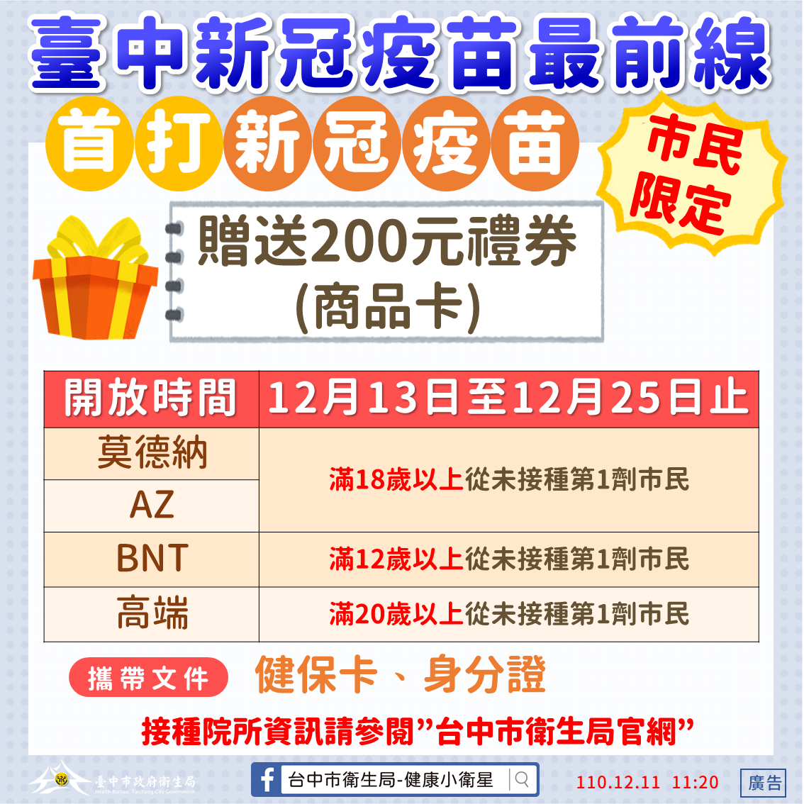 中市12月13日起推首打族接種禮  市民限定贈200元禮券