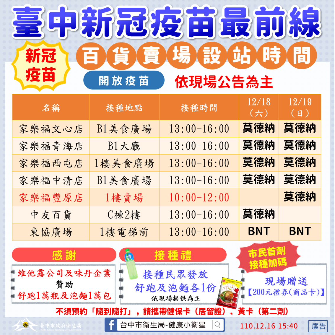 衛生局表示,感謝維他露公司捐贈舒跑飲料1萬瓶、味丹企業捐贈泡麵1萬包,共同響應台中百貨賣場新冠疫苗接種活動,這周末至中市7處站點接種疫苗者均可獲贈接種禮1份(舒跑及泡麵),另搭配中市自12月13日起至25日止推出的市民限定首打族接種禮,設籍台中的市民現場接種還可再領200元禮券,請市民施打時務必攜帶身分證及健保卡,以利身分認定核發禮券。相關接種地點已公佈於台中市政府衛生局網站(https://www.health.taichung.gov.tw/1937954/post ),歡迎查詢並踴躍接種。(12/17*18)*衛生局