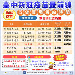 台中市上周末啟動百貨、賣場等人潮聚集場所設立疫苗接種站,廣獲好評,這周末12月18、19日將持續開設7個站點,打疫苗就送舒跑飲料及泡麵各1份,市民首劑接種可再領得200元禮券。市府衛生局提醒,請民眾攜帶健保卡、身分證(居留證)前往接種,如為接種第二劑民眾請記得攜帶黃卡,以利完整登錄接種資料。