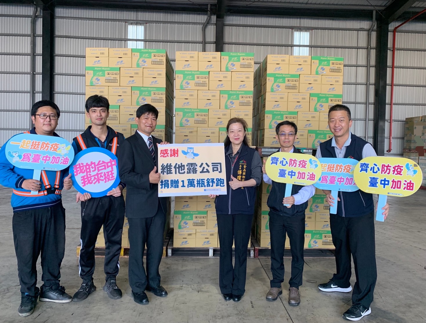 衛生局表示,感謝維他露公司捐贈舒跑飲料1萬瓶、味丹企業捐贈泡麵1萬包,共同響應台中百貨賣場新冠疫苗接種活動