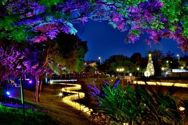 觀旅局表示,此次金色葫蘆墩布展範圍從第四區至第五區,共有8件光藝術作品,結合「聲音」呈現「聽覺」與「視覺」的沉浸感,帶給民眾全新感官體驗。第四區規劃兩座光藝術作品「織緒」及「轉念」,「織緒」以繽紛的顏色編排猶如迷宮,亮麗的色彩象徵生命中的多采多姿,也意味每條思緒創造著亮麗的未來,邀請大小朋友帶著探索樂趣穿梭其中,讓每一個入口成為未知的期待、每一個出口都是嶄新的開始;另一個作品「轉念」,以吉祥的葫蘆為意象,象徵即使經歷了時代變遷,心中仍轉動閃耀著豐原過往繁榮的感念。
