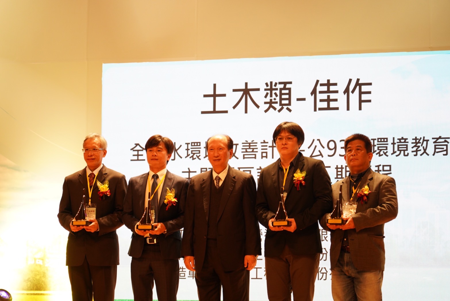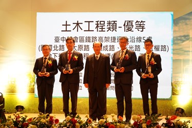 行政院公共工程委員會昨(23)日舉行第21屆公共工程金質獎頒獎典禮,台中市政府建設局以「台中都會區鐵路高架捷運化沿線5處(圓環北路、太原路、建成路、國光路、五權路)地下道填平工程-第二標(國光路、五權路)」及「全國水環境改善計畫-公93水環境教育主題園區計畫第二期工程」榮獲優等獎及佳作殊榮佳績肯定,建設局長陳大田率領建設局主管及同仁北上受獎,感謝同仁及廠商辛勞外,更期盼將台中優良公共工程品質好口碑推向國際。