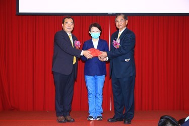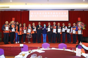 台中市金手獎得獎廠商協進會今(29)日舉行第15、16屆新卸任理事長交接典禮,由現任理事長洪欽瑞交接給新任理事長鄭國雄,市長盧秀燕出席監交印信及頒贈聘書,感謝洪前理事長帶領大家拚經濟、度過疫情難關,期許鄭理事長接任後盡心盡力為工商界服務,市府會持續與工商界攜手打造更優質產業環境,為台中拚經濟。