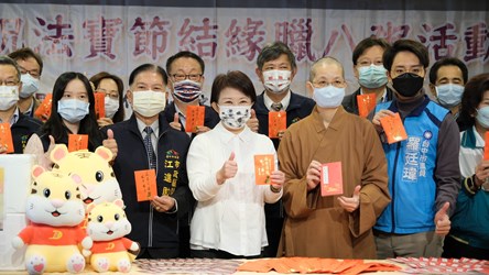 農曆十二月初八為佛陀成道日,又稱「法寶節」,佛光山惠中寺今(3)日特別準備臘八粥及春聯致贈給洽公民眾及市府員工。市長盧秀燕今日出席法寶節結緣活動時表示,華人傳統中,過年前都會吃臘八粥祈求新的一年平安,過去一年因新冠肺炎疫情,民眾很辛苦,期望今年的臘八粥能帶來平安、健康、順利,也期許國人不管遇到什麼逆境都能勇敢堅強。
