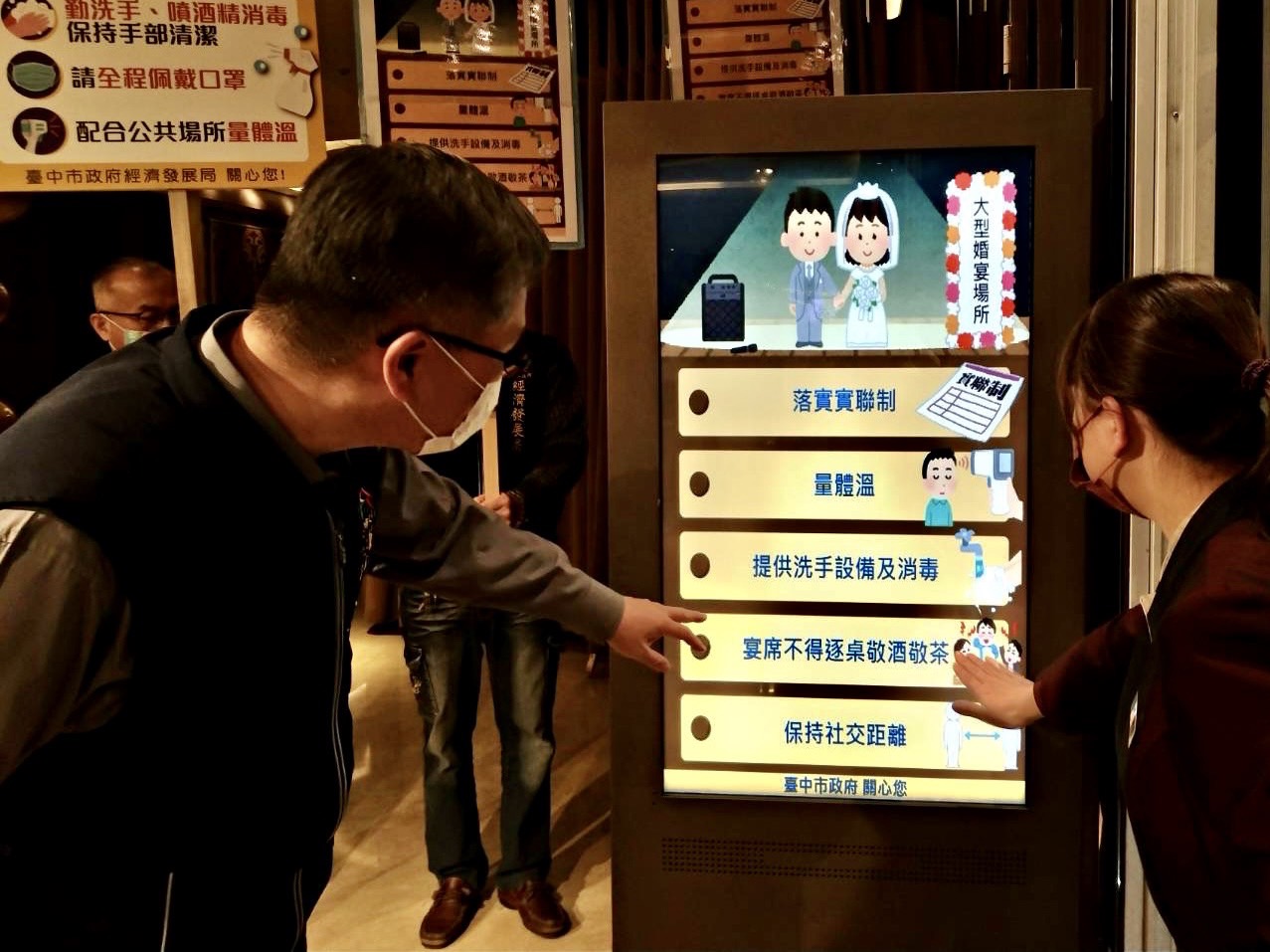 這次宣導前往南屯區潮港城國際美食館,業者除落實顧客進場管理、用餐管理外,也積極維持用餐環境良好通風,環境清潔消毒,近期加嚴的防疫措施,業者均透過相關迎賓公告、電話或口頭方式告知顧客,宴會進行前也會請主持人開場時再次提醒,避免聚餐之餘,不小心違反防疫規定,得不償失。