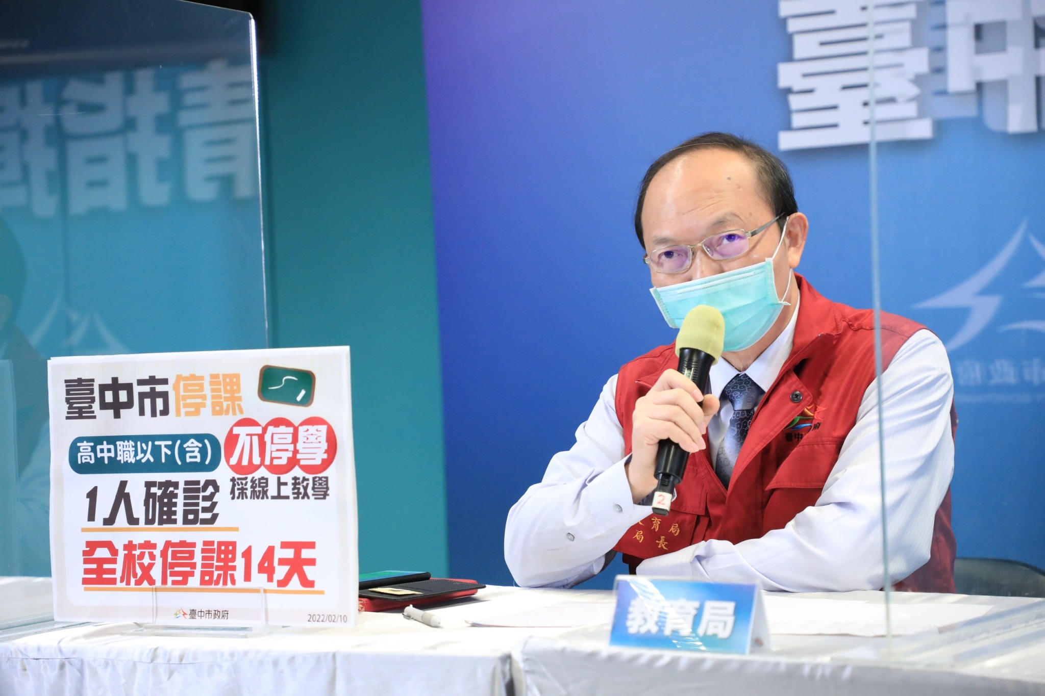 教育局長楊振昇表示,去年9月因國內出現多例Delta確診病例,市府已提高台中市學校停課標準為1人確診全校停課14天,由於Omicron新型變異株傳染速及發病速度快,為確保校園師生健康,仍將繼續維持比中央所訂停課標準還要嚴格的標準,學校師生1人確診,全校即停止實體上課14天,採線上教學。