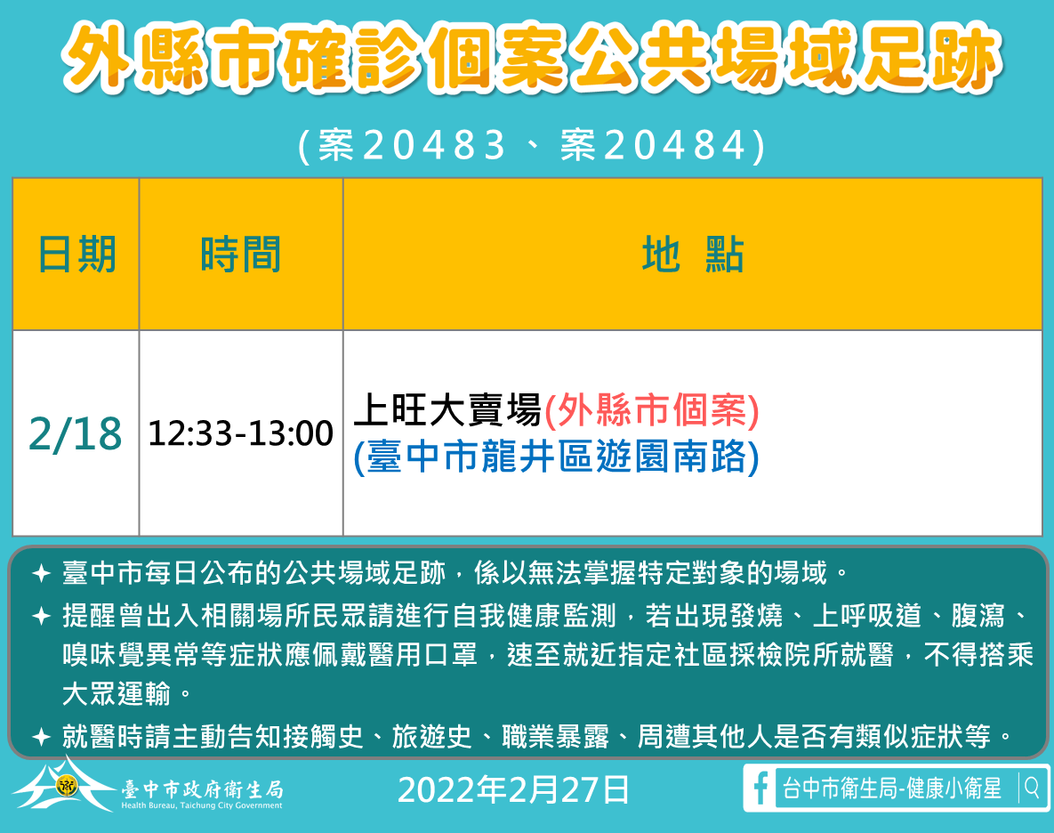 台中市政府昨(26)日下午獲北部縣市通知個案20483(2月23日發病,2月26日確診)、20484(2月17日發病,2月26日確診)曾於2月18日有台中市活動史,市府衛生局立即積極展開疫情調查,經查2案曾前往龍井區上旺大賣場買東西,已通知全面清消,並匡列工作人員及接觸者3人及安排PCR採檢,結果皆為陰性。