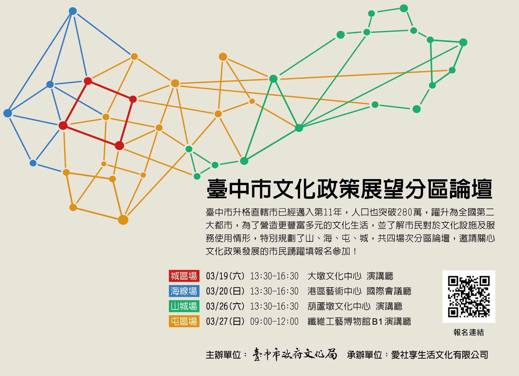 「臺中市文化政策展望分區論壇」共規劃四個場次,第一場3月19日(六)於大墩文化中心舉行,並於文化局Youtube頻道及「文化小尖兵」臉書粉絲專頁同步直播,並安排手語翻譯。第二場3月20日(日)於港區藝術中心,第三場3月26日(六)於葫蘆墩文化中心,第四場3月27日(日)於纖維工藝博物館舉行。各場次論壇活動將針對「文化生態系」、「文化網絡」、「文化品牌」及「文化傳承與創新」四大議題,邀請專家學者、藝文工作者和團體提供專業見解。有意現場參與意見交流的民眾,自即日起至3月16日可事先上網報名,因座位有限,額滿為止。
