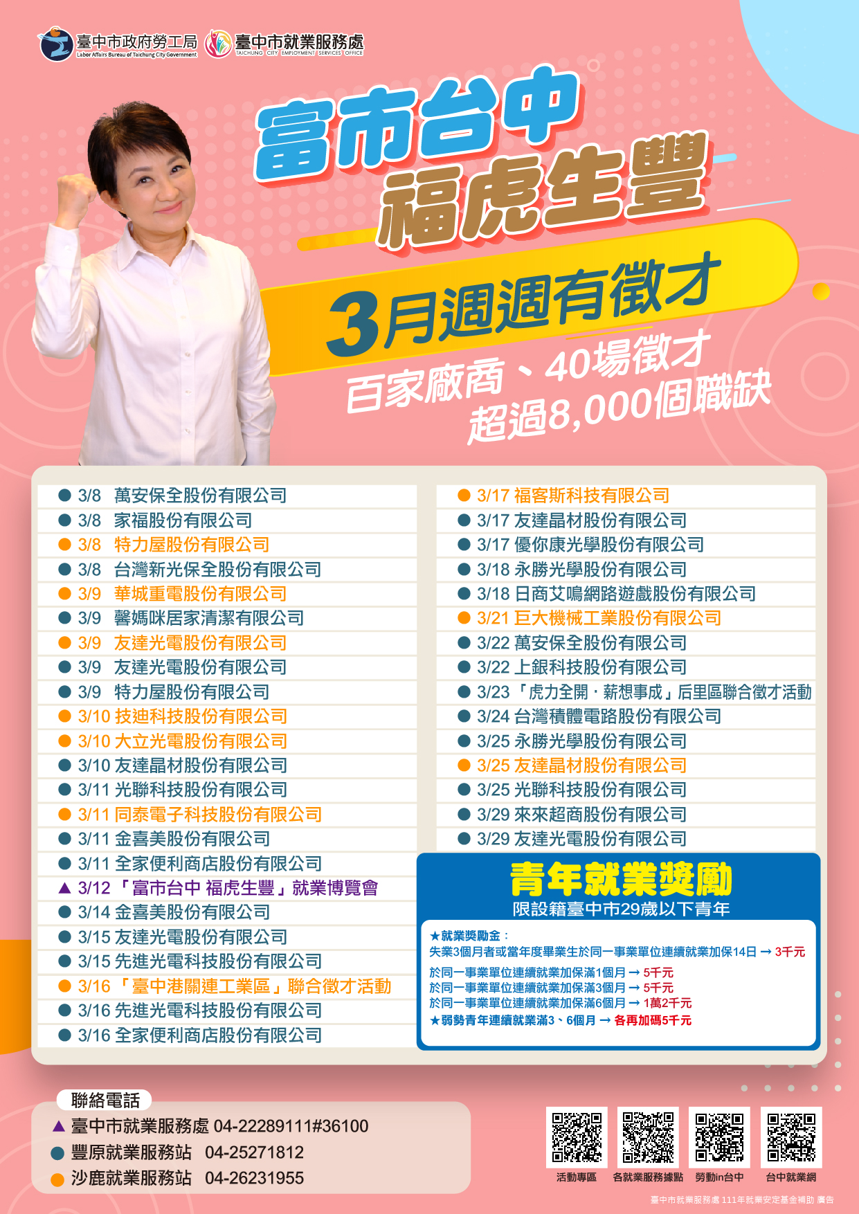 勞工局說明,台積電於中科園區籌設新廠、廣招人才,市府除了邀請台積電參與3月12日於中興大學辦理之「富市台中 福虎生豐」就業博覽會外,3月24日也合作在中科辦理客製化徵才活動,預計釋出1,000個薪資上看6萬元職缺。另外,也邀集上銀科技、友達光電、巨大機械及矽品精密等100家廠商,釋出8,000個就業機會,其中漢鐘精機及妙印精機均開出6萬元高薪。