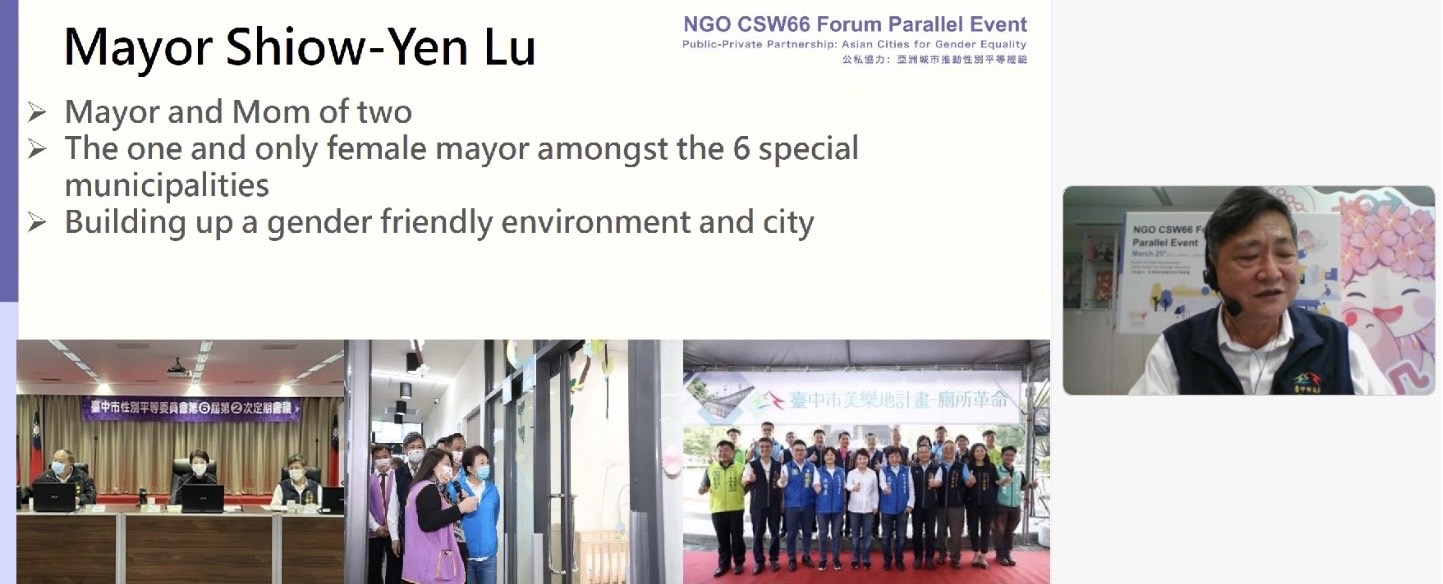 社會局說明,聯合國非政府組織婦女地位委員會提供民間各領域申請舉辦平行會議,因應疫情轉為線上會議,今年就有超過百場線上平行會議,可謂國際性平交流盛會。台中市政府社會局與台中市晚晴協會合作,成功申請1場平行會議,邀請菲律賓Iriga市長兼城市與地方政府聯合會財務長及亞太區聯合主席Madelaine Yorobe Alfelor、北九州亞洲女性論壇理事長堀內光子、台灣基地協會組長鄭寬民及台中市晚晴協會榮譽理事長黃秀惠共同參與,首次透過國際平台向世界倡議台中市的性別平等。