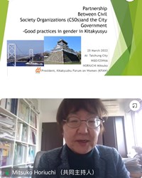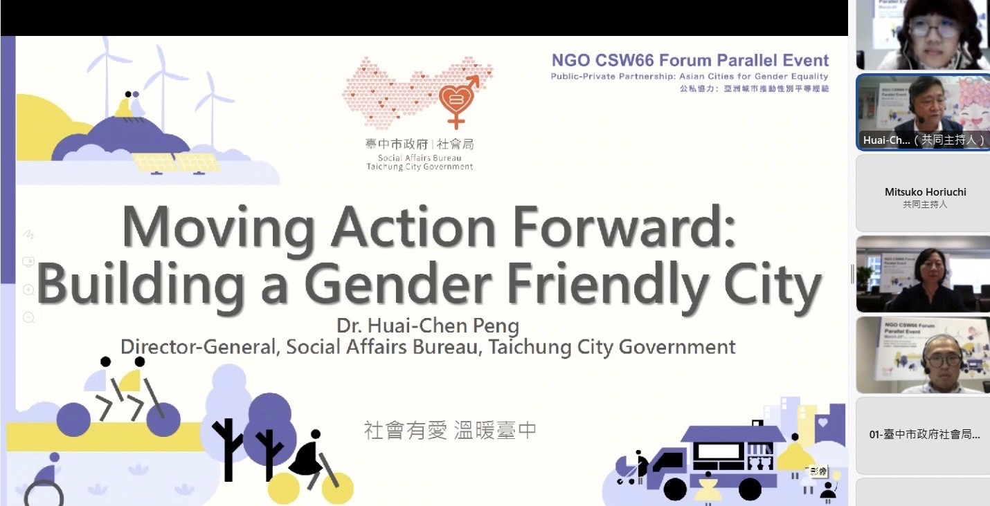 聯合國第66屆非政府組織論壇(NGO CSW66)是國際婦女界年度重大盛會,台中市政府社會局今(25)日首度舉辦NGO CSW66線上平行會議,與菲律賓Iriga市及日本北九州市跨越地域,交流「公私協力:亞洲城市推動性別平等經驗」,並同步於影音平台線上直播,吸引逾百位國內外民眾參與。